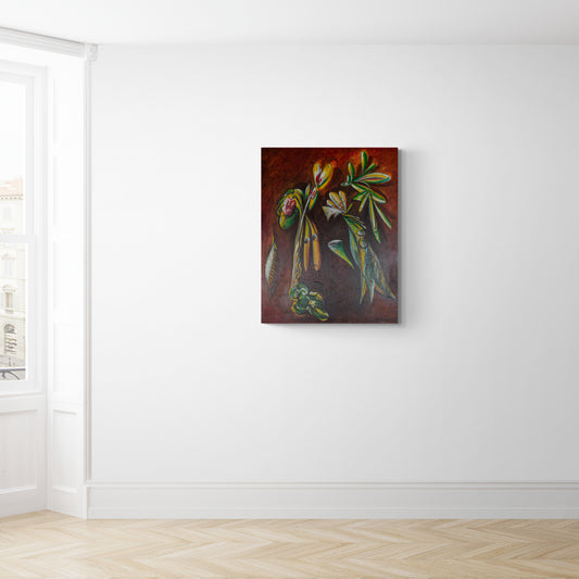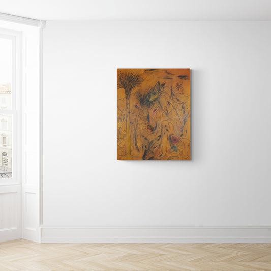 Karl Dennig's color palette is always elegant and aesthetic. Whether pastel-ethereal and transparent in yellow or rosé, heavy and melancholic in the deep blue tones or vital and optimistic in bright red. His images are dense fabrics, overlays of galaxies, sgraffito of loosely or precisely silhouetted plant forms, leaves, shells, four-legged friends , of feathers, fish, birds, fossils and more rarely of somnambulistic human figures: symbolic abbreviations of his powerful world of experience. Dennig is an outstanding draftsman – complex, encapsulated, introverted, his vignette-like, rhythmic “developments” underpin the captivating, seemingly playful lightness of his pictures. Dennig, the all-rounder, also designs furniture, such as tables or throne-like armchairs made of forged iron, as well as carpets made of silk and wool.