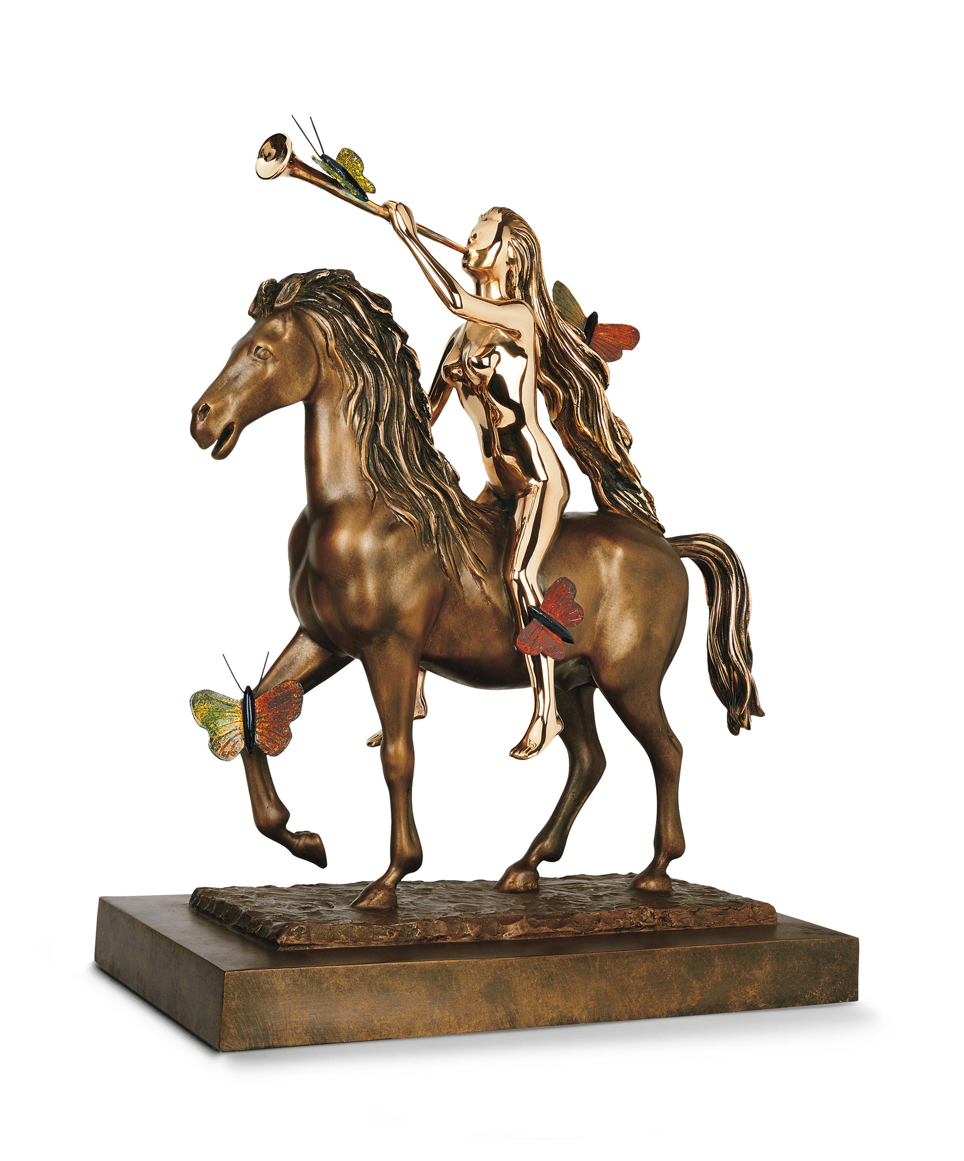 Dalí griff dieses Motiv ab 1976 auf und gab ihm eine surreale Dimension: Schmetterlinge, Sinnbilder für Transformation und Unsterblichkeit, zieren ihren Körper. Anders als in vielen Darstellungen verbirgt sie sich nicht hinter ihrem Haar, sondern zeigt stolz ihre Weiblichkeit. Die Trompete, erhoben gen Himmel, verkörpert Triumph und den Aufbruch in eine neue Zeit.