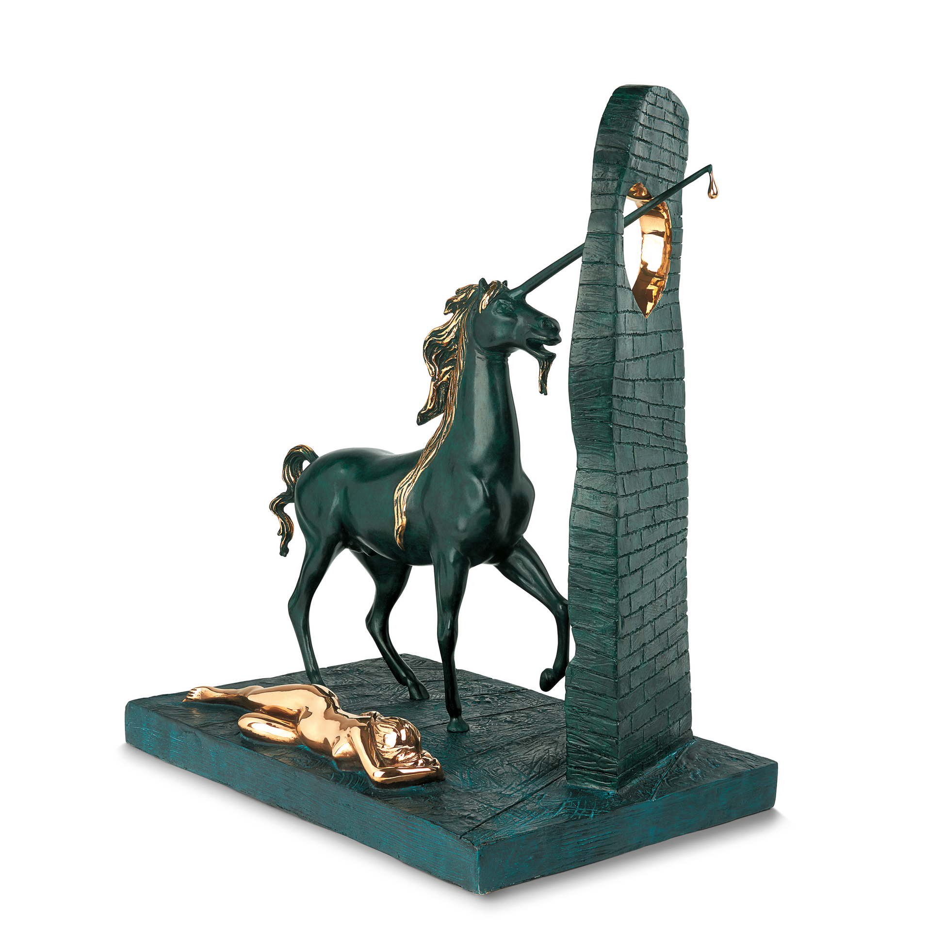 Das Horn des Einhorns durchstösst das Herz, aus dem Blut tropft – ein kraftvolles Sinnbild für Leidenschaft und Verletzlichkeit zugleich. Dalí griff das Motiv immer wieder auf, fasziniert auch von der perfekten Spirale des Nashornhorns. In dieser Skulptur vereinen sich die Symbole von Mauer, Herz, Einhorn und der weiblichen Figur im Vordergrund zu einem vielschichtigen Bild von Liebe, Reinheit und Sinnlichkeit.